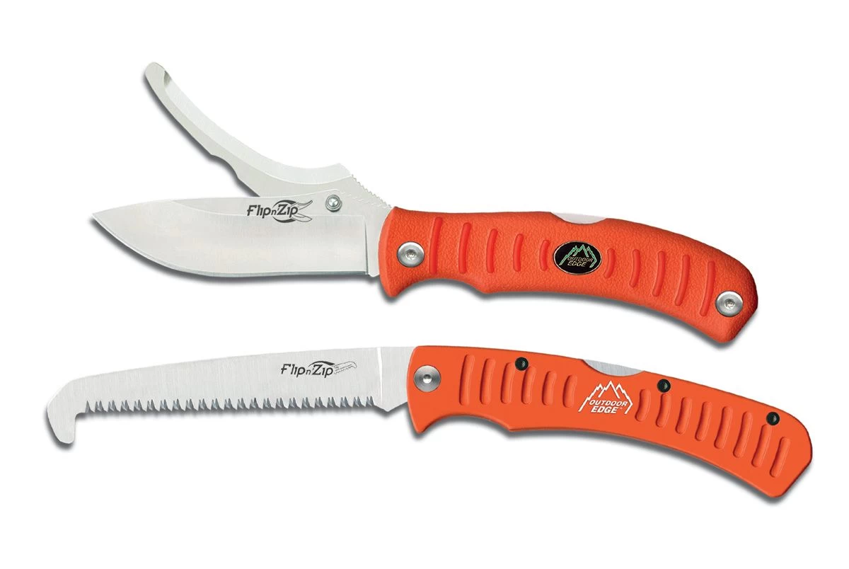 The Flip n’ Zip Combo with easy to locate blaze orange handle. Both skinning and gutting blades open, close and lock independently. Ergonomic rubberized Kraton handles with Traction-Slots offer a secure non-slip grip. Stainless 8Cr13MoV blades with one hand opening studs are hand finished shaving sharp. Triple ground folding saw with rubberized aluminum handle. Makes easy work of cleaning game and clearing limbs. Complete with quality nylon belt sheath